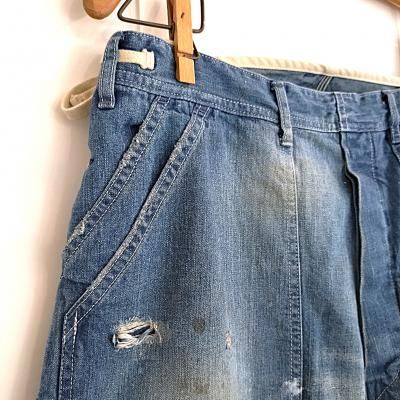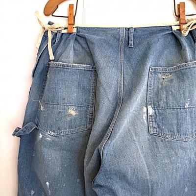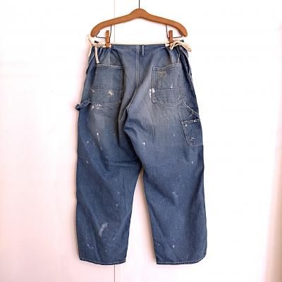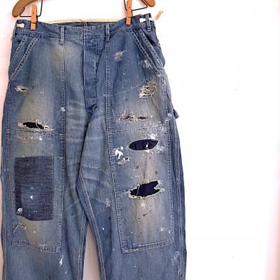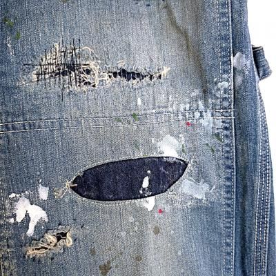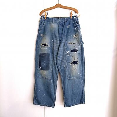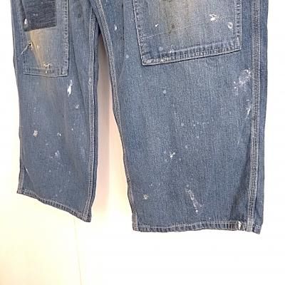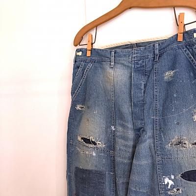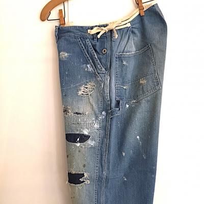 H.UNITのデニムワークトラウザーH-PT094。オーバーオールをカットしカスタムを施したようなデザインのDenim Side Open Painter Pants。製品加工でUSED加工を施し、それに1点1点ダメージや汚れを施し、Vintegeに見られるようなリペアを施し長い時間をかけ色落ちし履き込まれたデニムパンツのような1本に仕上げた、H.UNITらしいデニムパンツ。
