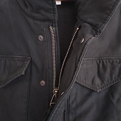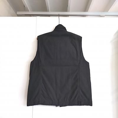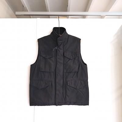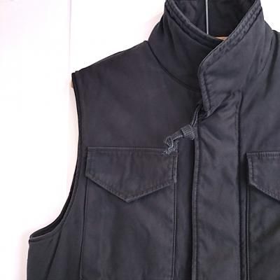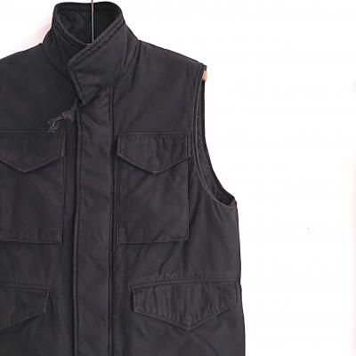 このベストはM-65ジャケットをモチーフに作られていて、表地に強度があるバックサテン地を使用し古着のような風合いの加工を施しています。
